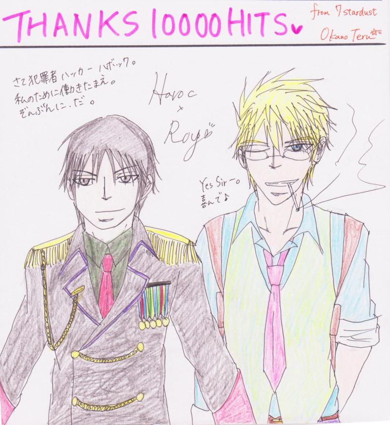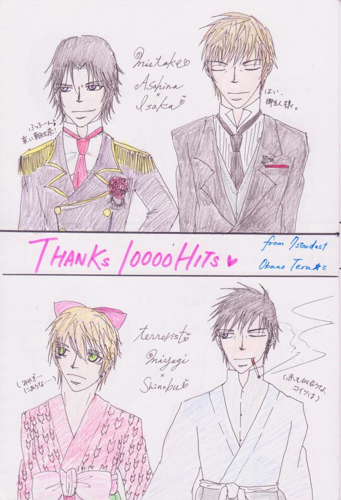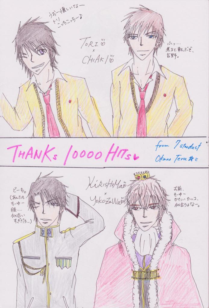 というわけで最後はアンケート1位2位なトリチアと桐横で!!トリチアは学生服(記憶を辿ってかいた!)、桐横は王様×SPなコスプレにしてあります!!というわけで、10000ひっと御礼イラストでした!!!これからもよろしくです!!